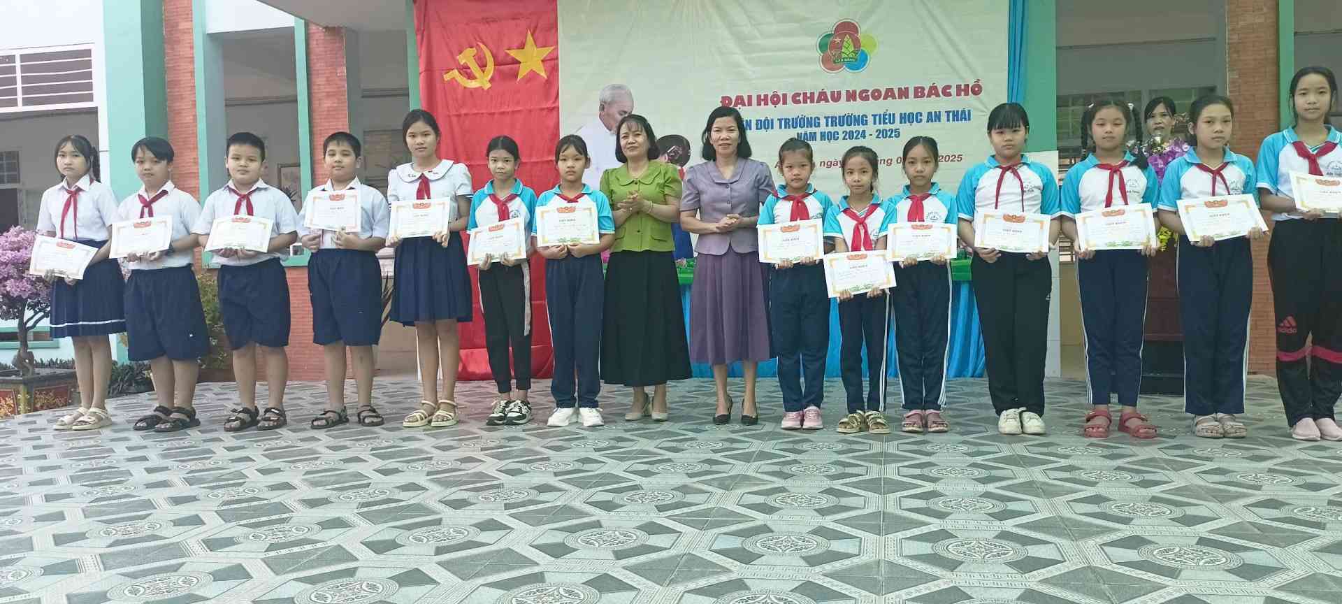 🎉🎉 Kết quả trong đại hội đã trao 05 giấy khen của CT. UBND xã An Thái cho 5 bạn đội viên có thành tích xuất sắc trong phong trào công tác đội, 15 bạn có thành tích xuất sắc trong phong trào công tác đội cấp trường và trao giấy chứng nhận cháu ngoan Bác Hồ cho 100% Đội viên của Liên đội.